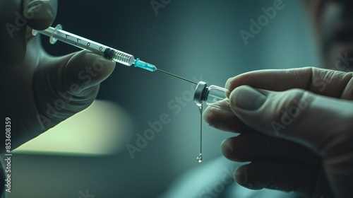 Close-up of a doctor's hand and syringe, with serum drops just leaving the needle..