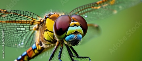 Closeup of a dragonfly with blue and yellow wings on a green background. Macro photography of insect with detailed texture. Concept of nature, beauty, and fragility.