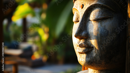 Closeup of a face in relaxation mode, leaning against a wooden column of a Thai veranda, natural evening glow