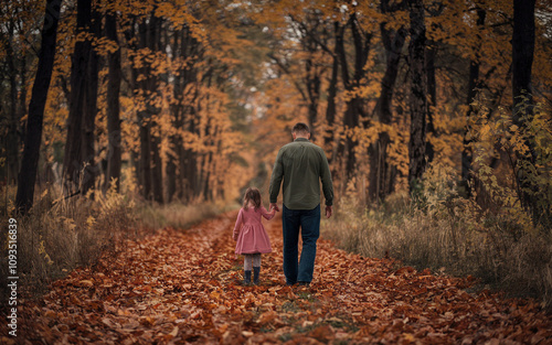 Close-up of a father and daughter enjoying a walk in an autumn forest, sharing a fun moment outdoors together.