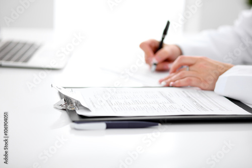 Close-up of a female doctor filling out application form , sitting at the table in the hospital