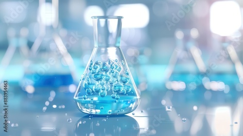 Close-up of a flask filled with blue liquid and bubbles, representing science and research.