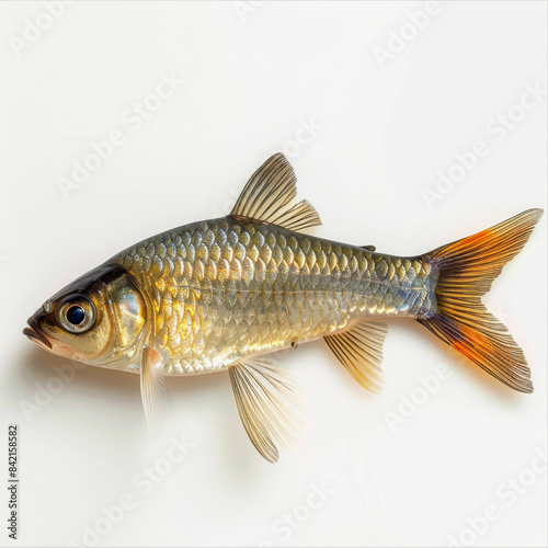 Close-up of a fresh fish with shiny scales and fins against a plain white background, showcasing its details.