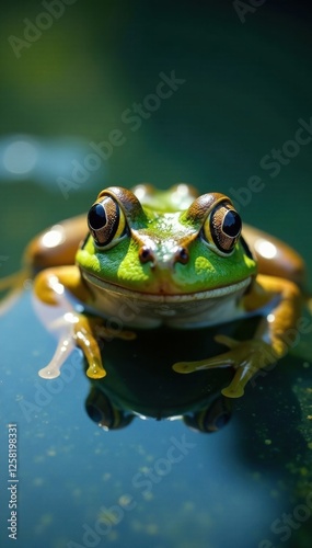 Close-up of a frog's face in the water with ripples and reflection, peaceful, surface tension, serene