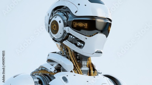 Close-up of a futuristic white robot head with visible mechanical components and golden wires.