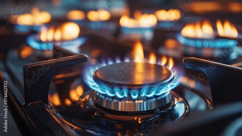 Close-up of a gas stove with multiple burners lit, with blue flames.