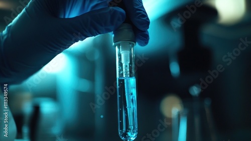 Close-up of a gloved hand holding a test tube with a blue liquid in a laboratory setting.