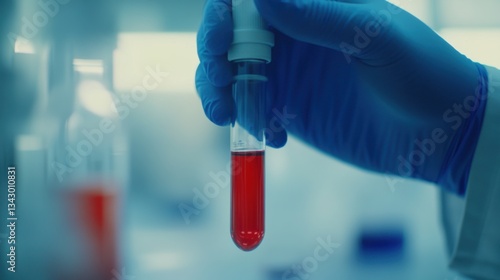 Close-up of a gloved hand holding a test tube with red liquid in a laboratory setting.