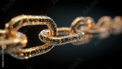 Close-up of a golden chain, intricately detailed with glowing particles, stretching into the dark background