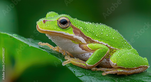 Close-Up of a Green Tree Frog Covered in Dew Drops on a Leaf, Representing Natural Beauty and Environmental Awareness