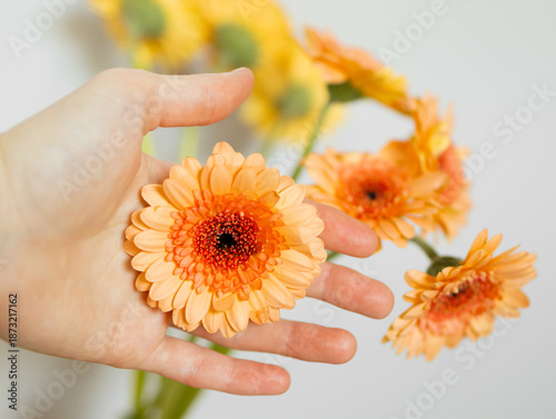 Close-up of a hand gently holding an orange gerbera daisy with shallow depth of field, capturing natural beauty, warmth, tenderness, and floral elegance in soft light.