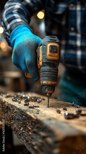 Close-up of a hand in a blue glove using a power drill to screw a screw into a piece of wood. Surrounding the screw are other screws