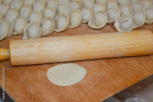 close-up of a hand rolling out dough with a wooden rolling pin on a wooden surface dumplings pelmeni in rows cooking homemade food traditions preparation recipes tutorials cuisine family