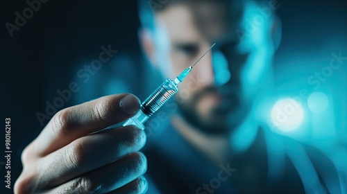 Close-up of a healthcare professional holding a syringe, emphasizing precision and readiness for medication or vaccination.