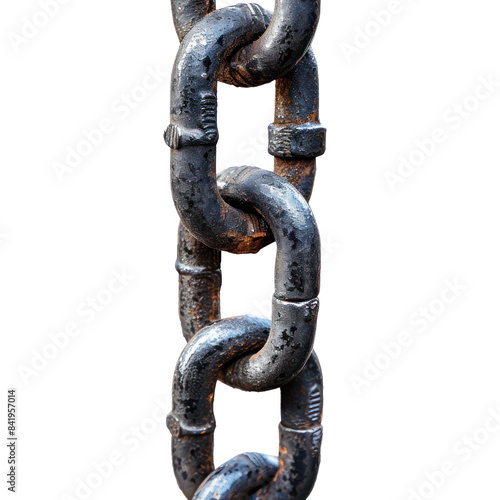 Close-up of a heavy-duty rusted metallic chain link, showing texture and industrial strength, isolated on a white background.