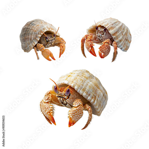 Close-up of a hermit crab in a white seashell isolated on a white background