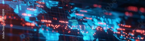 Closeup of a hightech world map with fluctuating financial indices, glowing blue and red, illustrating the pulse of global trade and economics