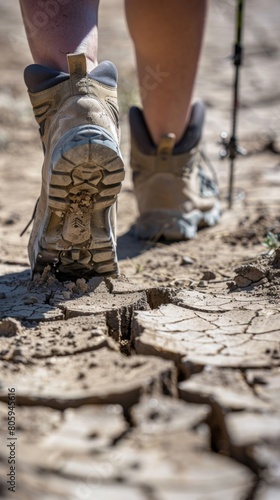 Close-up of a hikers boots, showcasing the dusty trail, cracked earth, and determined stride