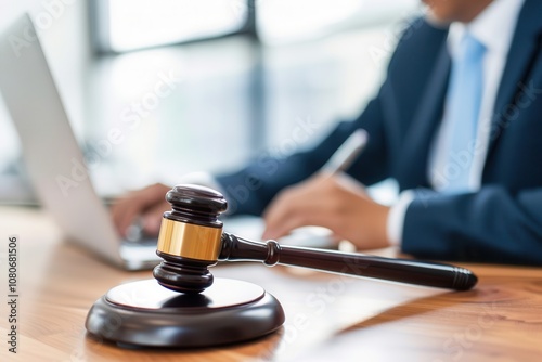 Close-up of a judge’s gavel on a desk, with a lawyer in a suit working on a laptop in the background, symbolizing legal work and justice.