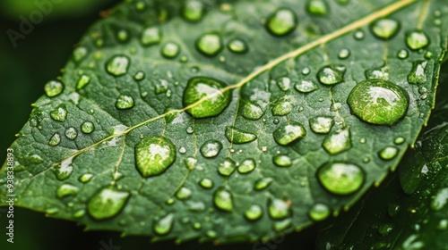 Close-up of a leaf with fresh water droplets after a rain, capturing the texture and transparency of the droplets