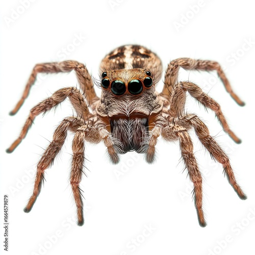 Close-up of a light brown spider with eight legs, three prominent eyes, and a segmented body