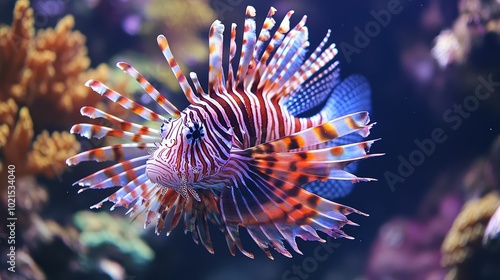Close-up of a lionfish swimming near coral, its venomous spines radiating outward in vibrant colors.