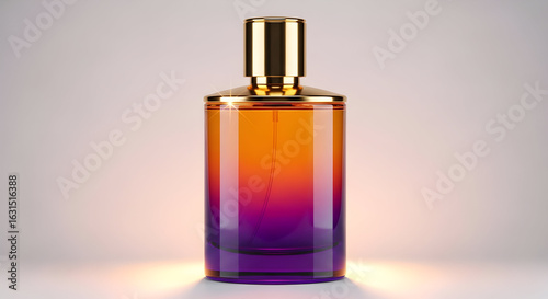 Close-up of a luxury perfume bottle with a vibrant purple and gold design