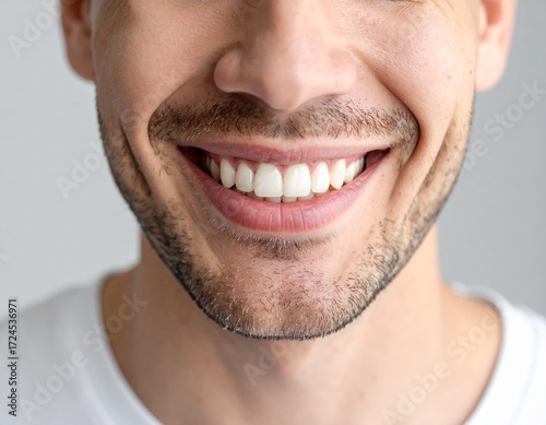 Close-up of a man smiling with beautiful, straight white teeth. His clean face is well-groomed, and he is wearing formal attire such as a crisp white shirt, tie, or suit jacket.
