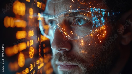 Close-up of a man wearing protective glasses with data reflections, symbolizing technology, innovation, and future technology.