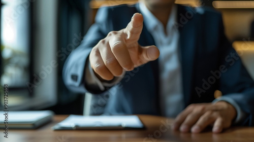 Close-up of a man's finger pointing at something while sitting at a desk in a suit.