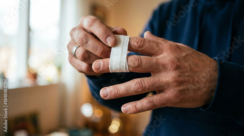 Close-up of a man's hands carefully wrapping a bandage around his injured finger, providing first aid and self-care