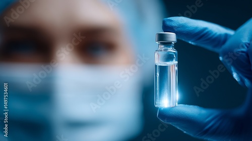Close-up of a medical professional holding a vial in blue gloves. The background is softly blurred, emphasizing the vial. This image represents healthcare and medical advancements. AI