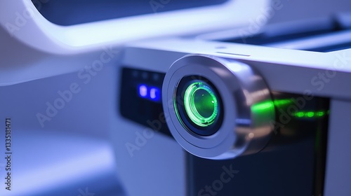 Close-Up of a Modern Digital Projector Lens with Green Light and Technological Background