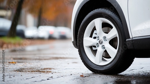 Closeup of a modern vehicle wheel on a wet street during autumn with reflections : Generative AI