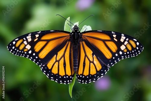 Close-up of a monarch butterfly perched on a green leaf, ready to take flight