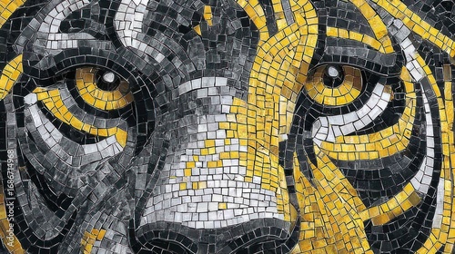 Close-up of a mosaic tiger face, dominated by piercing yellow eyes. Grey and gold tiles form the fur, creating a dramatic and intense wildlife artwork