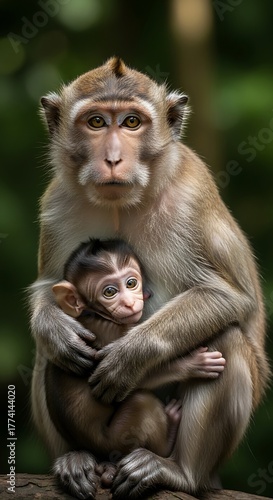 Close-up of a mother macaque monkey tenderly holding her baby in a lush green forest.