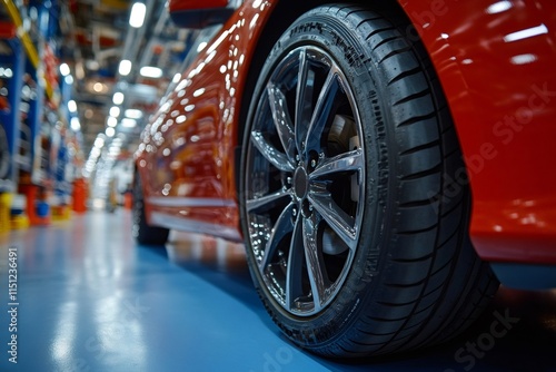 Close-up of a new car tire in a modern assembly line