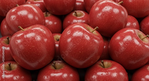Close-up of a Pile of Shiny Red Apples with Water Droplets, Fresh Fruit Background