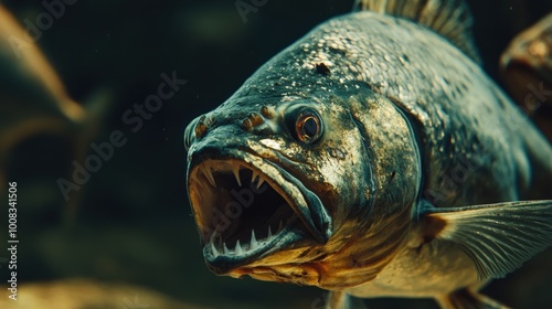 Closeup of a Piranha fish with its mouth open revealing sharp teeth.