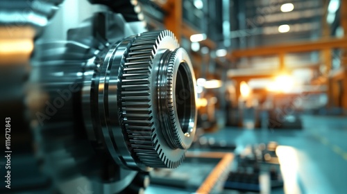 Close-up of a precision-engineered metal gear in a factory setting.
