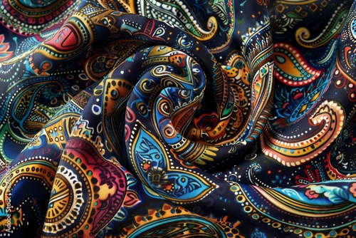 Closeup of a richly-hued patchwork quilt showcasing an eclectic mix of floral, striped, and abstract fabric panels. Whimsical, handcrafted textile concept.