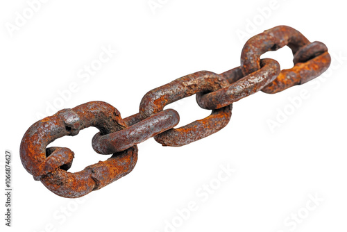 Close-up of a rusty chain on a white background, showcasing its texture and condition