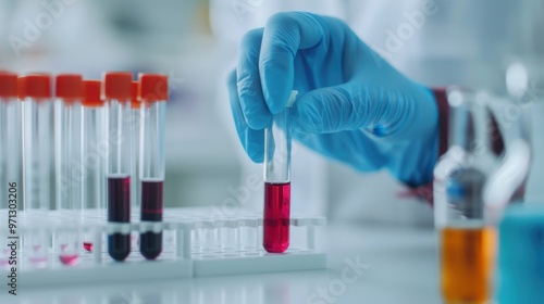Close-up of a scientist's hand using a pipette to transfer liquid into test tubes containing colorful chemicals in a modern laboratory.