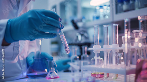 Close-up of a scientist's hands holding a test tube with a chemical solution in a lab