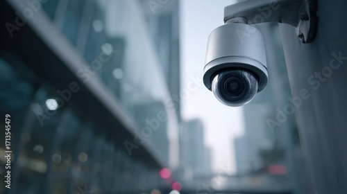 Close-up of a security camera against a modern cityscape backdrop, emphasizing surveillance and safety.