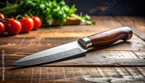 Close-up of a Serrated Knife on a Wooden Surface Alongside Fresh Tomatoes and Green Herbs