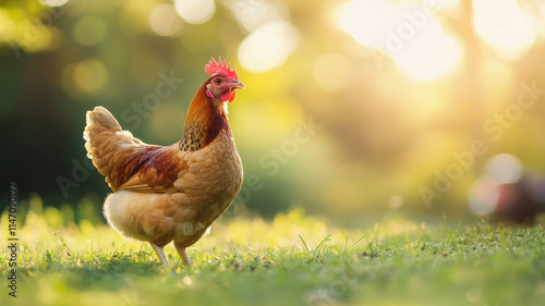 Close-up of a single free-range chicken standing on a patch of grass, with blurred greenery and soft light in the background, perfect for farm-to-table visuals.