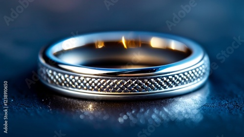 Close-up of a single silver ring with intricate engraving, showing the fine texture of the metal, small scratches, and subtle light reflections along its polished surface