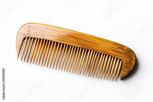 Close-up of a sleek bamboo hair comb with natural wood grain, placed on a pristine white background, showcasing eco-friendly beauty and self-care item.